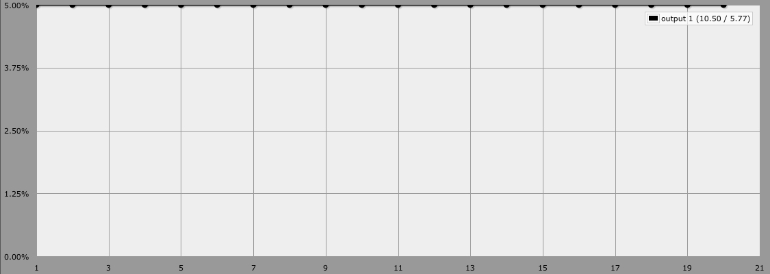 In addition to looking pleasantly symmetrical, that bell curve says something. It says that, when you roll multiple dice to obtain a single outcome, you’re likely to see a cumulative number in the middle of the possible range of outcomes. That’s why an average Attribute in D&D is a 10; it’s why you rolled 3d6 instead of 1d20. Indeed, if you rolled 1d20, the bell curve would look like this: